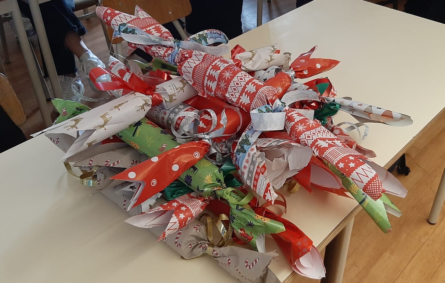 O Grupo de Inglês, do 3.º ciclo, organizou a atividade “Celebrating Christmas with Xmas Crackers”. Os alunos do 9.º ano aceitaram o desafio de recriar os típicos Christmas Crackers britânicos usando materiais reutilizáveis, honrando o tema anual da escola: “Ser voluntário…