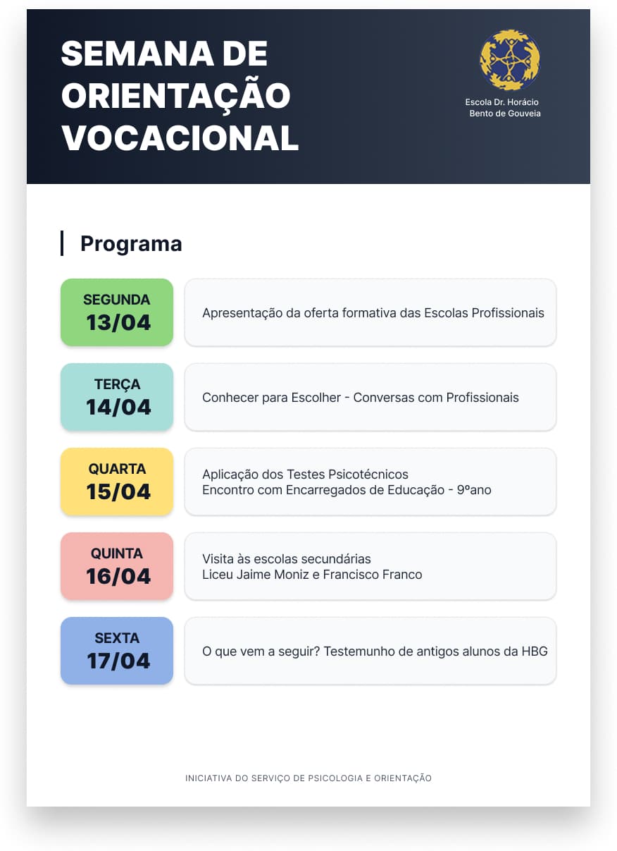 A Semana de Orientação Vocacional está a chegar à Escola Básica dos 2.º e 3.º Ciclos Dr. Horácio Bento de Gouveia. De 13 a 17 de abril, os alunos finalistas terão a oportunidade de contactar diretamente com profissionais de diversas…