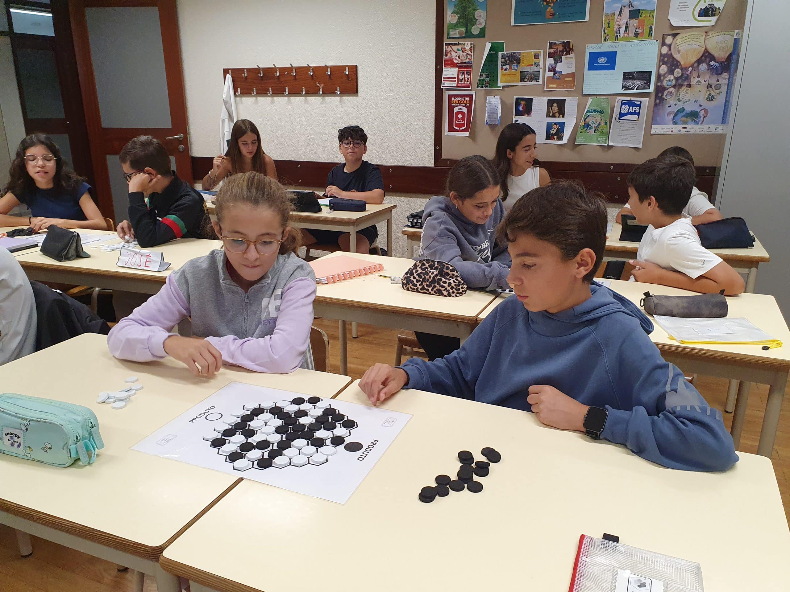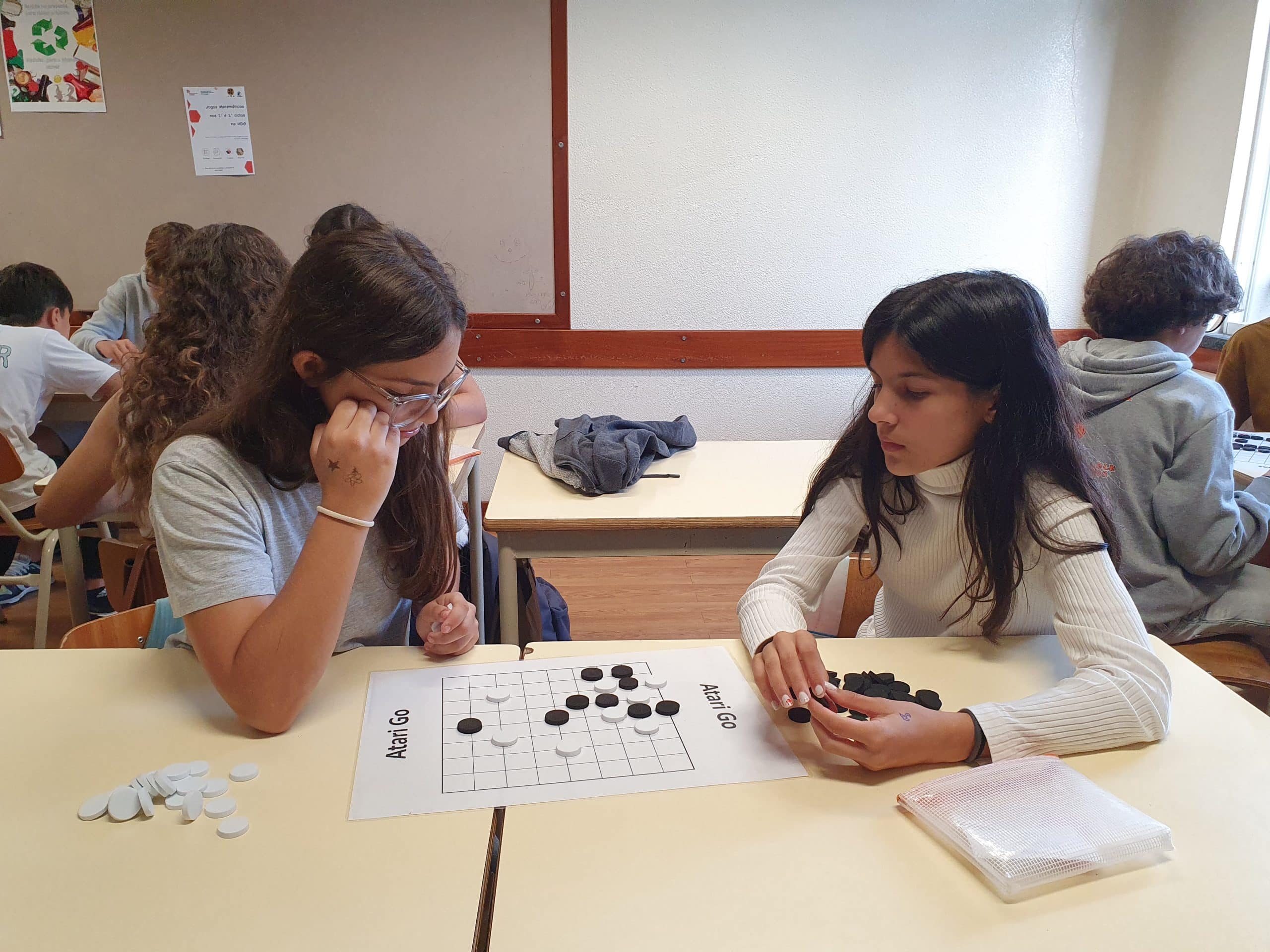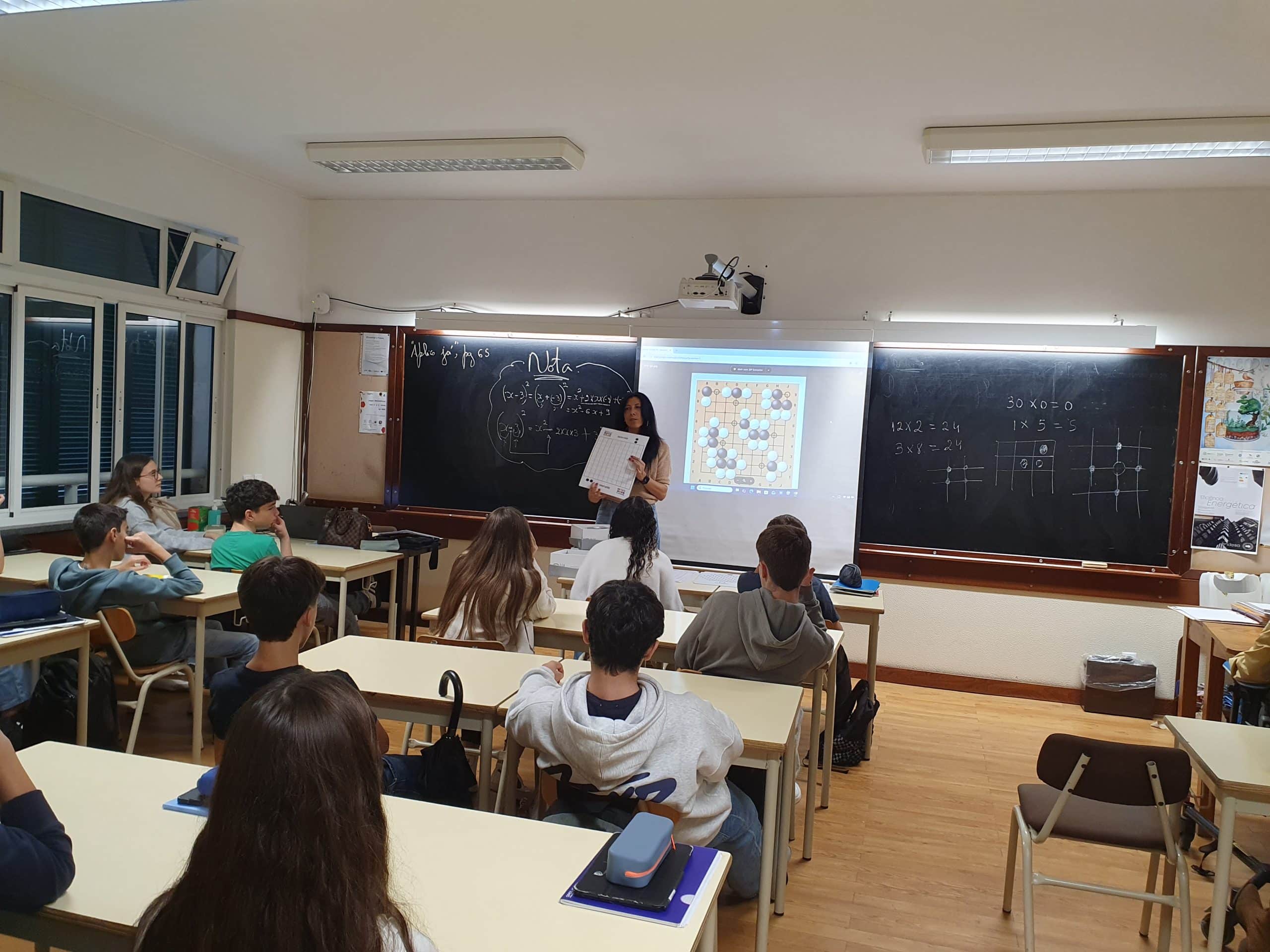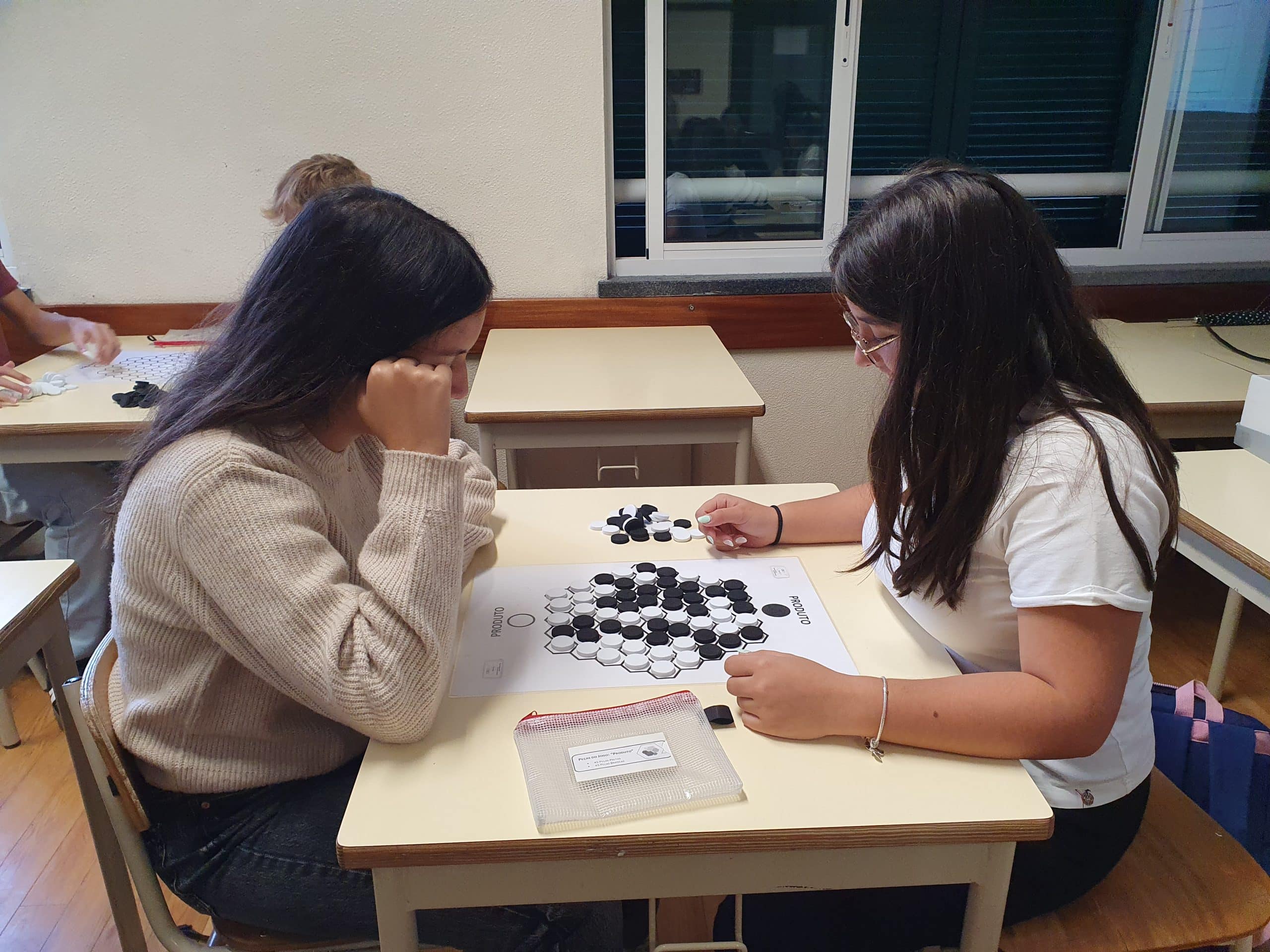 Os alunos tiveram oportunidade de experimentar jogos como Quelhas, Atari Go, Produto, Dominório Rastros, explorando estratégias e tomada de decisões em tempo real.