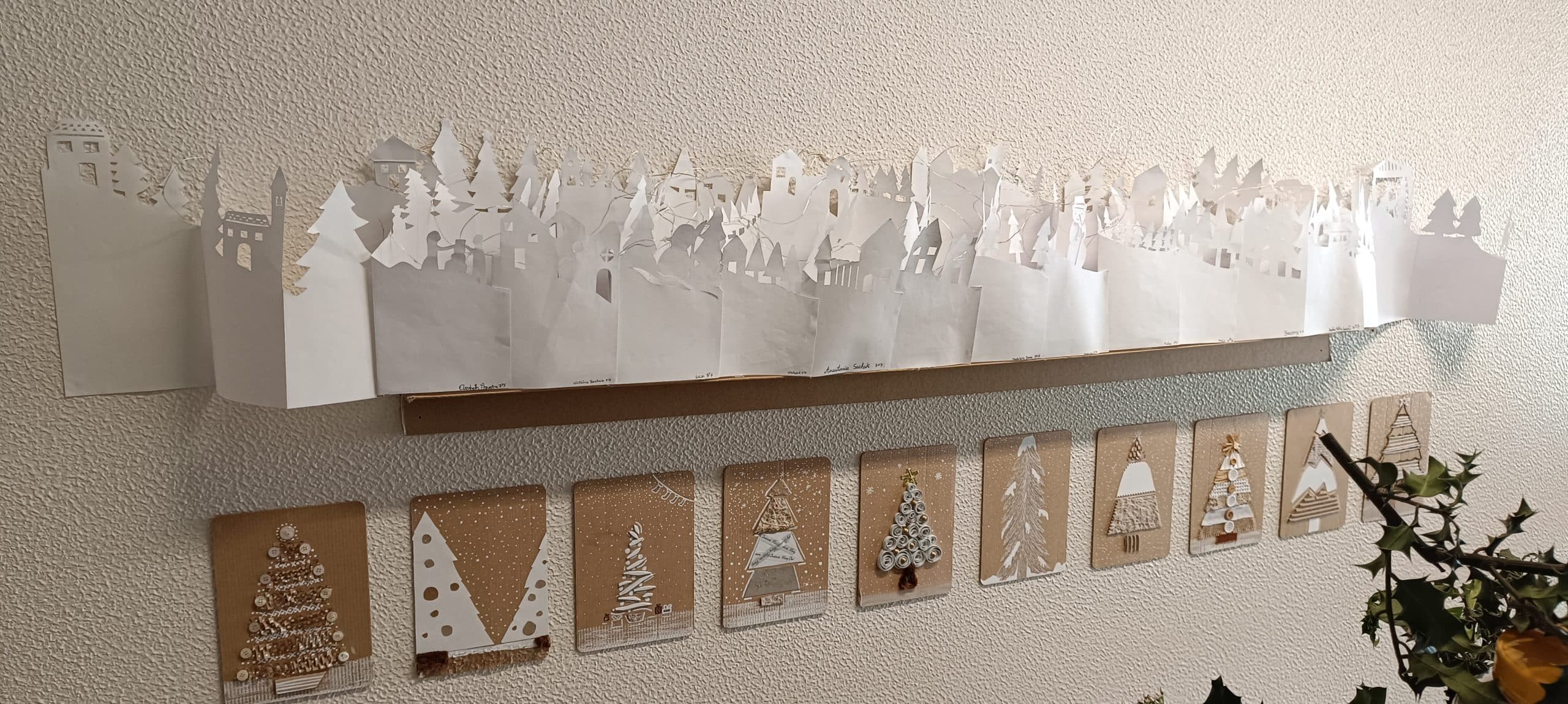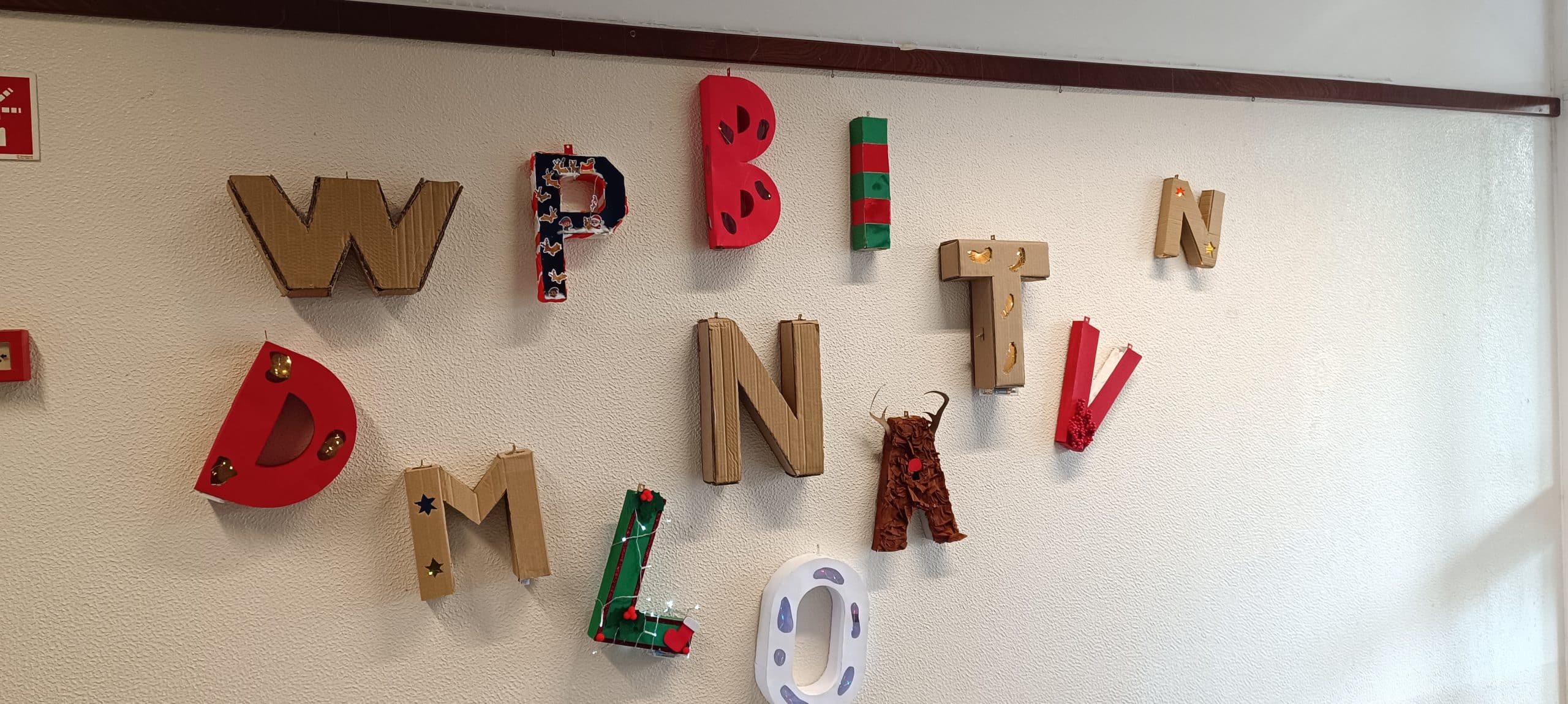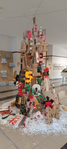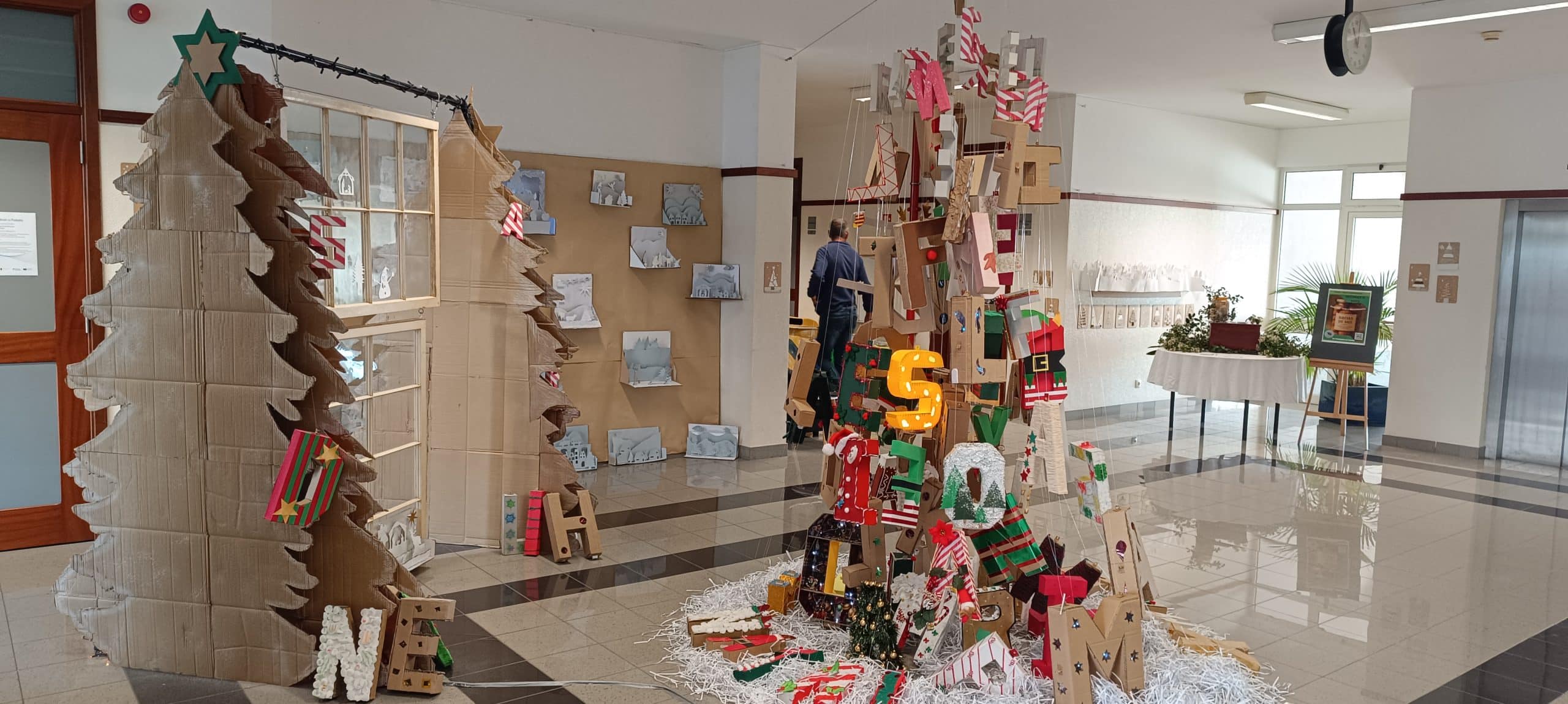O Natal é uma época rica em comunicação. As mensagens com votos de amor, paz e saúde multiplicam-se. Cada vez mais o conceito de presente e os hábitos de consumo de massas devem fazer-nos refletir. Ao invés de adquirirmos novos materiais, muitas vezes plásticos, devemos regressar ao “saber fazer”. Foi este o objetivo transmitido aos nossos discentes e trabalhados em prol desta instalação artística. A comunicação é feita “letra a letra”, onde cada aluno contribuiu com a sua construção 3D. As letras foram decoradas com motivos natalícios, num apelo à criatividade e à linguagem plástica alusiva a esta época, sempre com base na reciclagem de papeis e cartões.