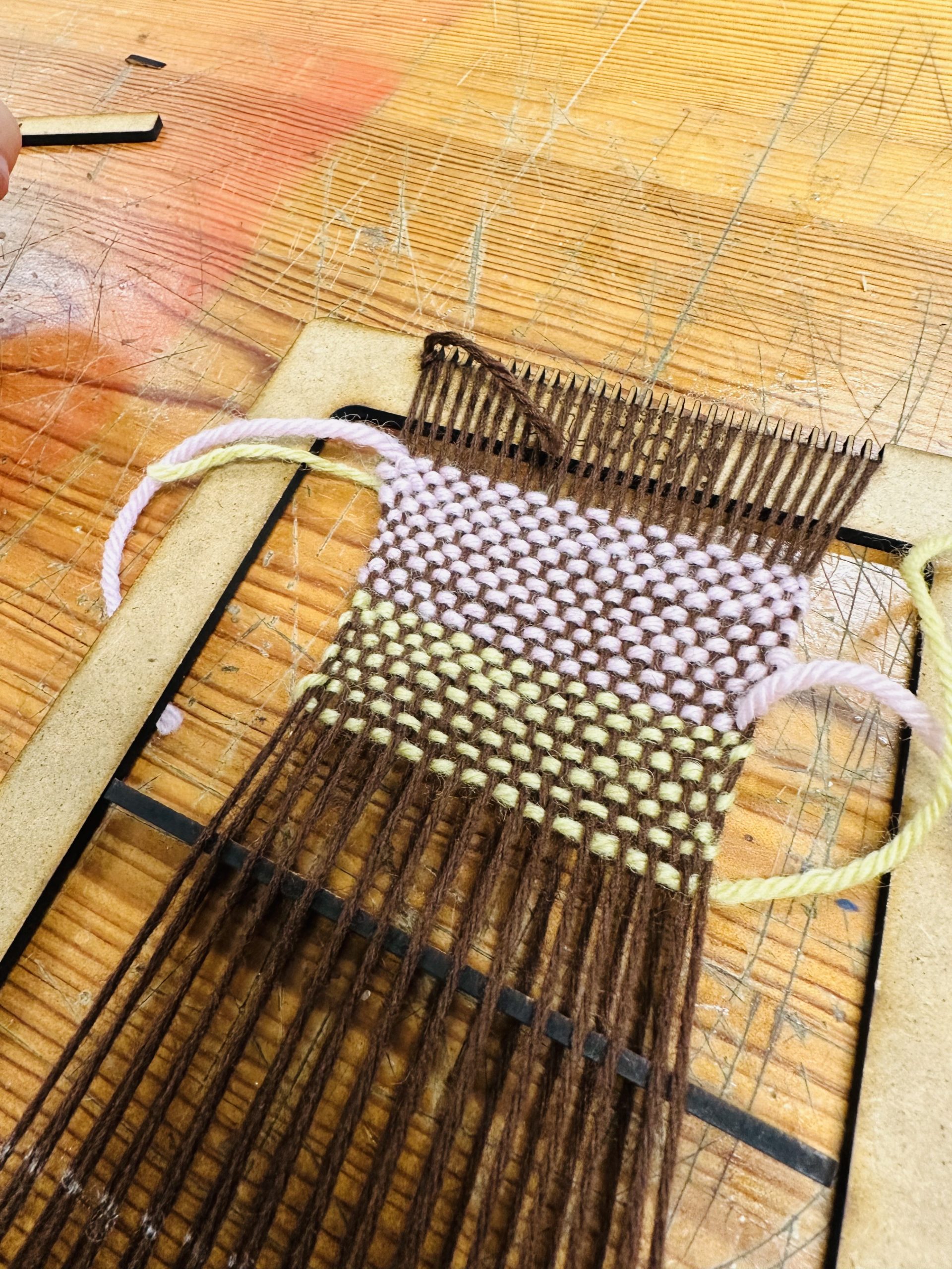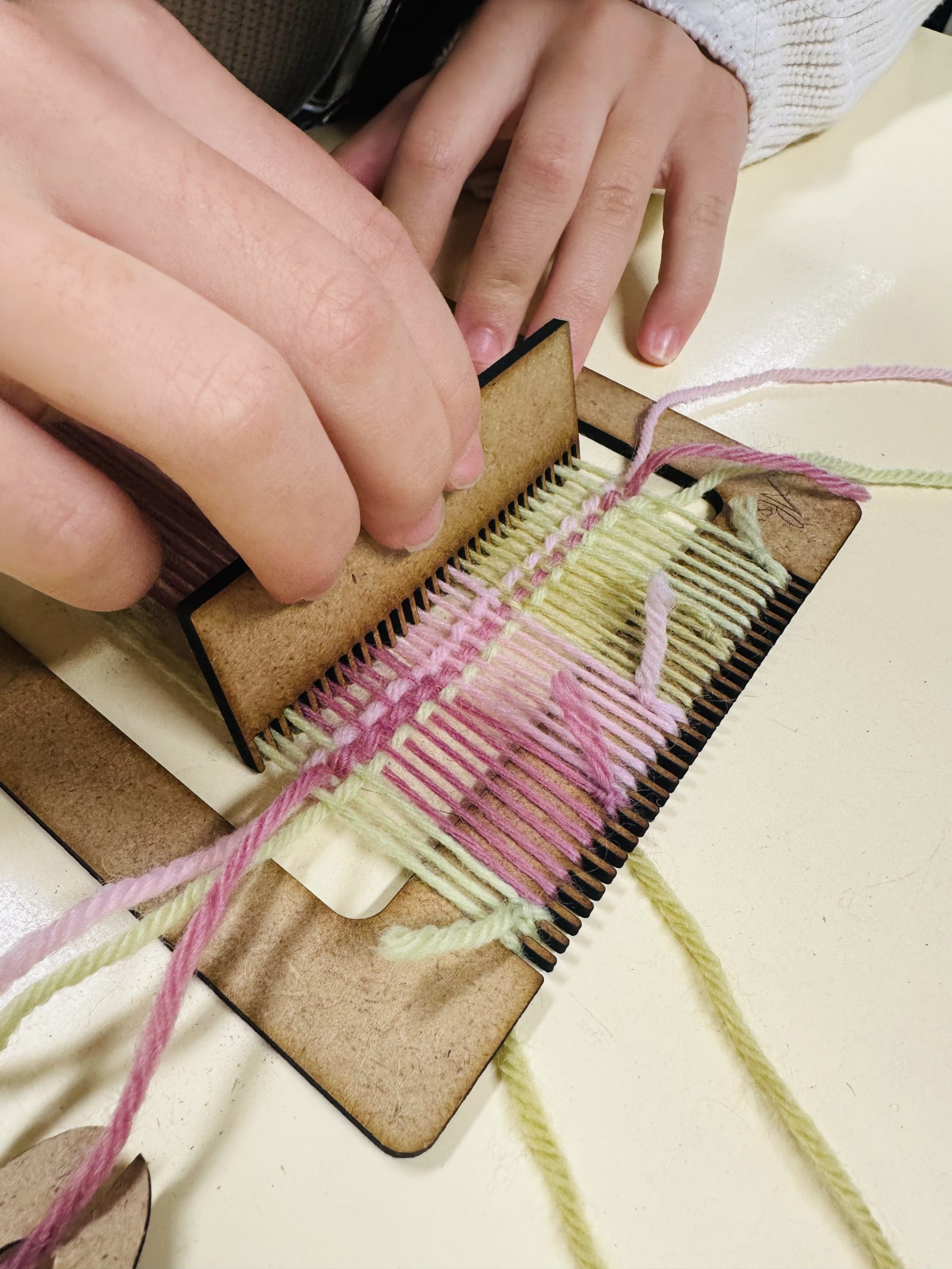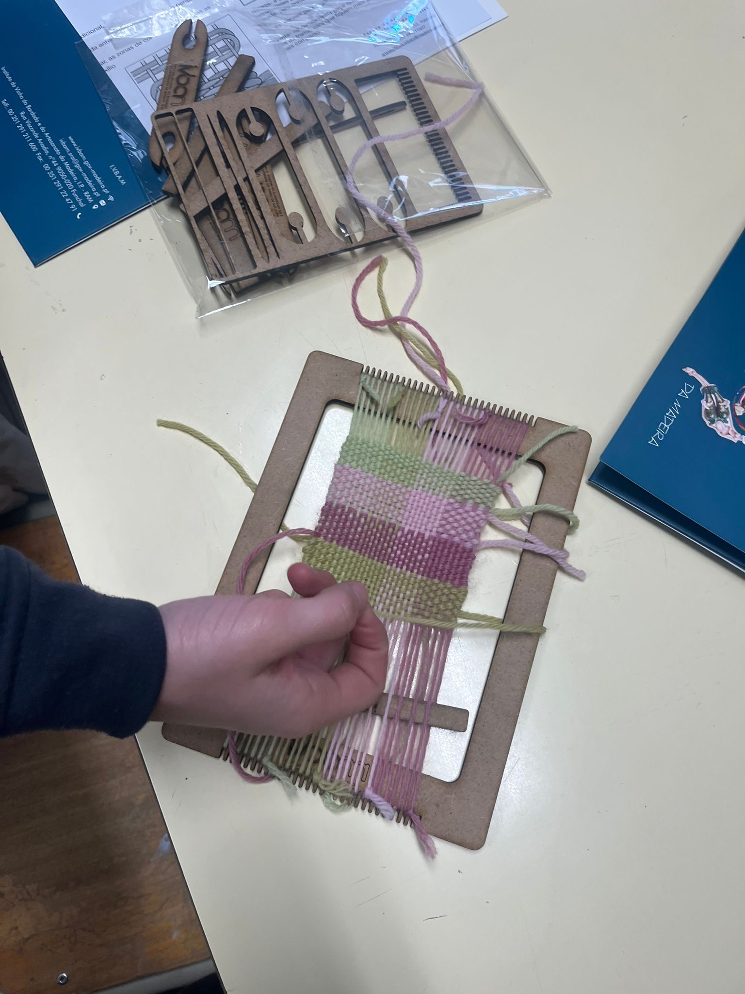 Durante a sessão, os alunos tiveram contacto com diferentes materiais, ferramentas e estruturas simples de tecelagem, explorando as suas características e funções. A atividade permitiu compreender princípios básicos do processo tecnológico associado à tecelagem, nomeadamente a organização dos fios (urdidura e trama), a relação entre material e textura, bem como as etapas de construção de um pequeno objeto têxtil.