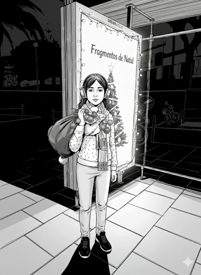 “Fragmentos de Natal” é um monólogo sobre Clara, interpretada por Maria Bettencourt, uma jovem voluntária que, numa noite fria e solitária, espera pelo autocarro numa paragem com luzes de Natal avariadas. Enquanto carrega um saco de enfeites partidos, ela reflete sobre a solidão e as imperfeições da vida. Através da metáfora de uma bola de Natal rachada que ainda reflete luz, a peça transmite uma mensagem de esperança: mesmo “partidos” por dentro, todos mantemos a capacidade de brilhar. A história termina com a chegada do autocarro, deixando a mensagem de que a nossa luz reside, precisamente, na beleza das nossas cicatrizes e na coragem de resistir.