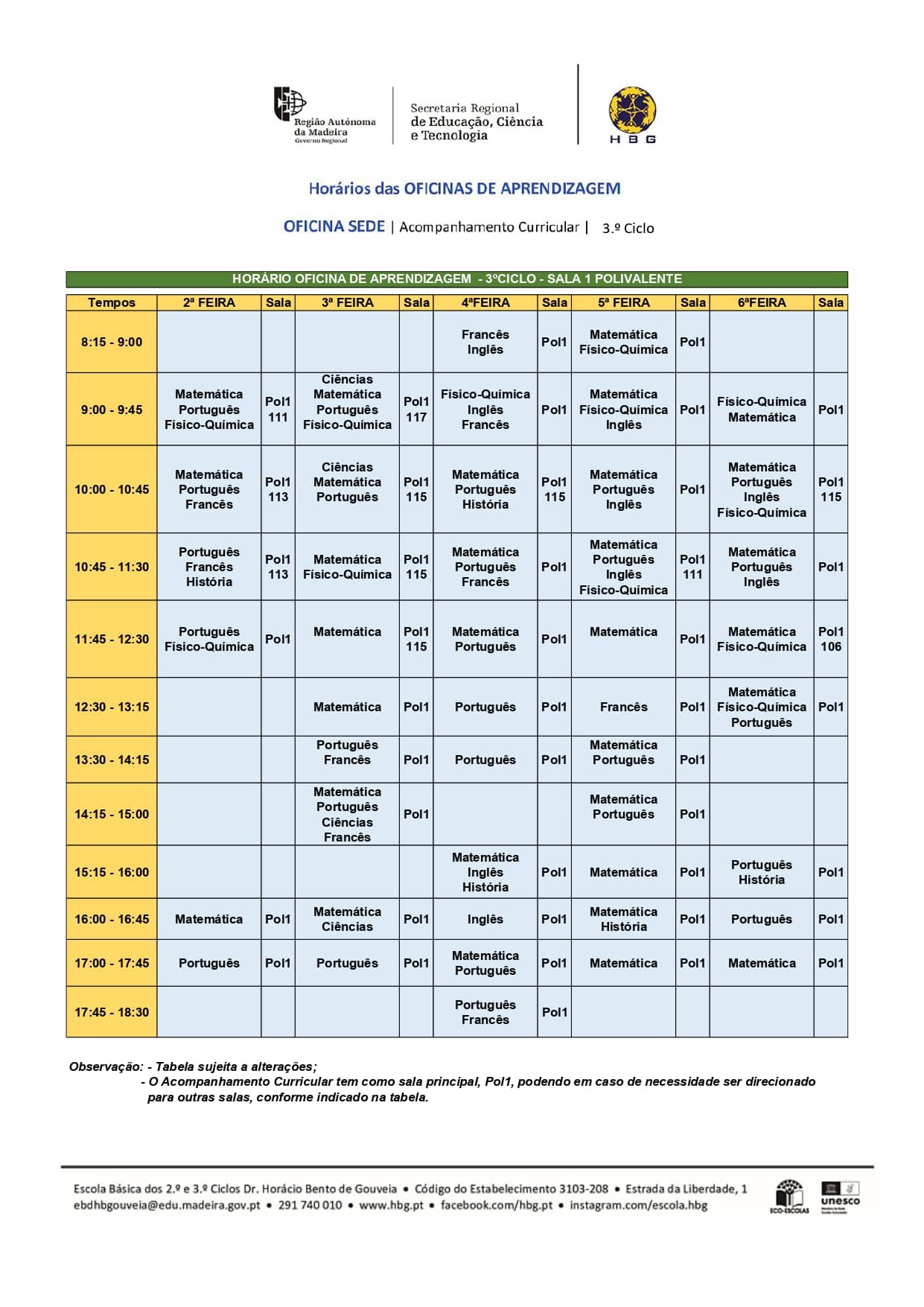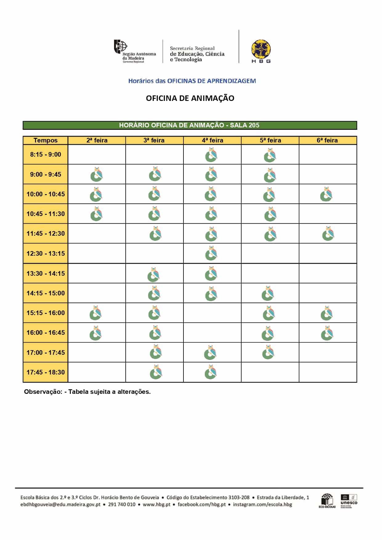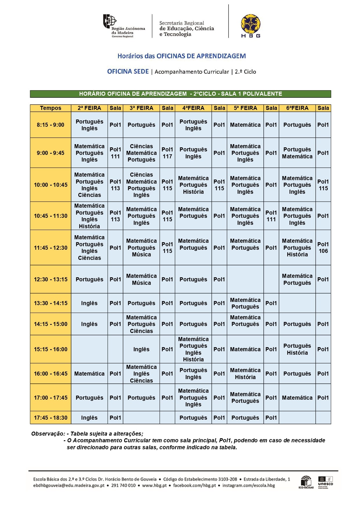 Horários – Oficina de Aprendizagem 2.º Ciclo (disciplinas) * Quarta-feira, das 9:00 às 9:45, o acompanhamento curricular de Português está suspenso. Oficina das animação 3.º Ciclo (disciplinas) Nota: Os horários podem ser alterados sem qualquer aviso prévio