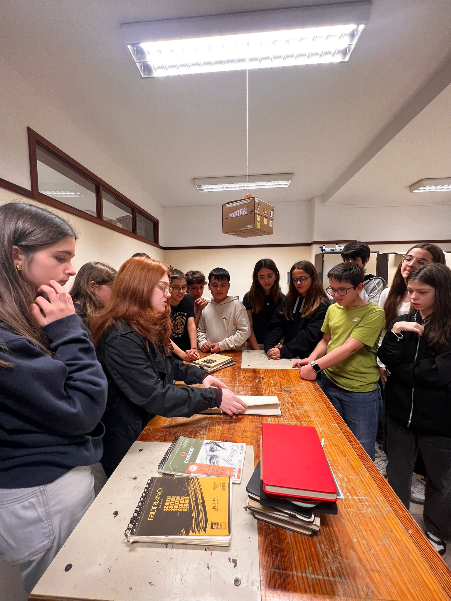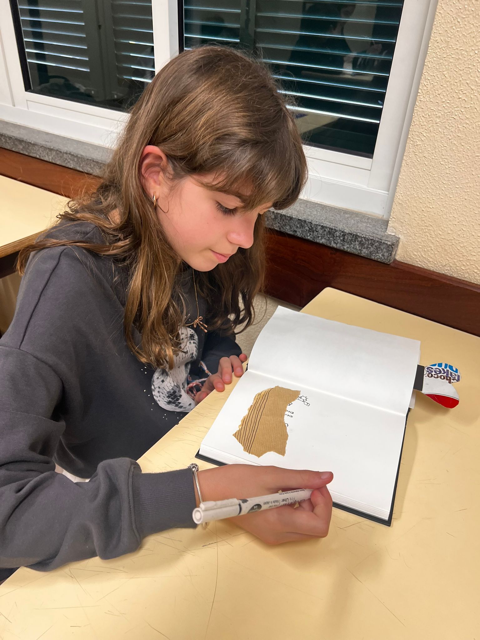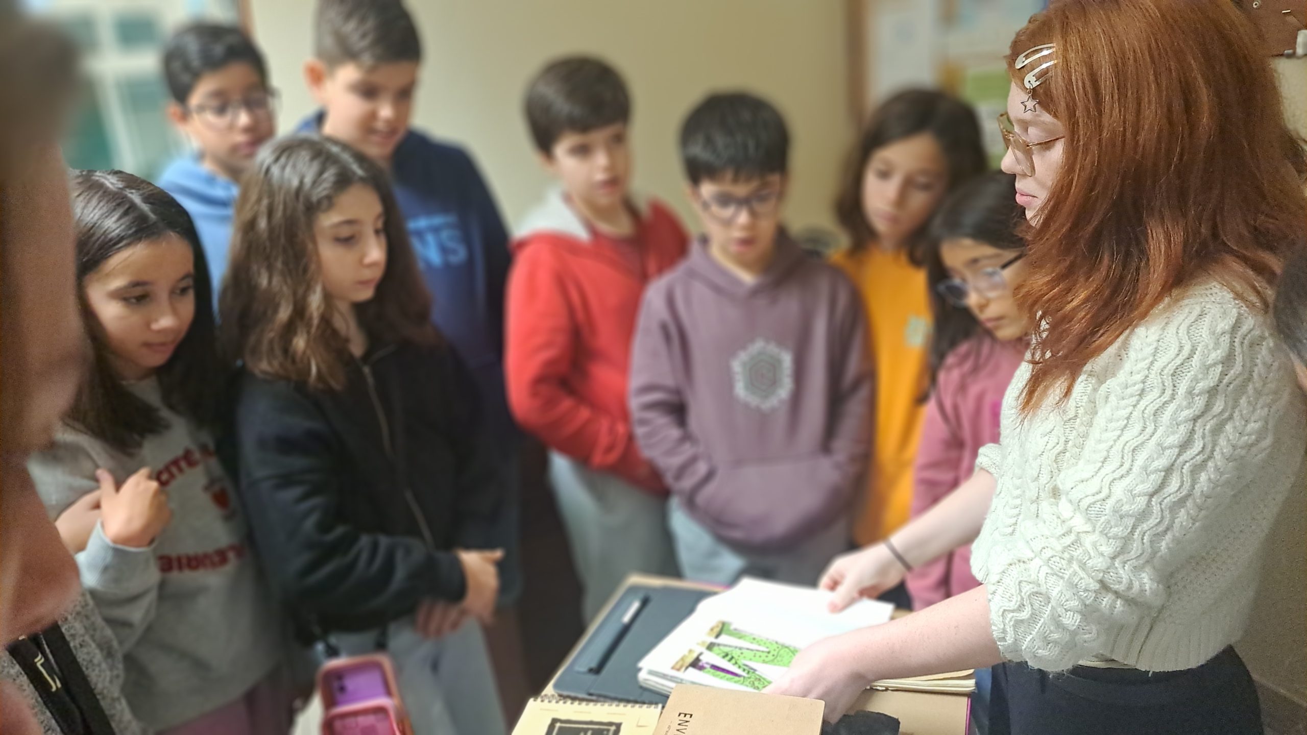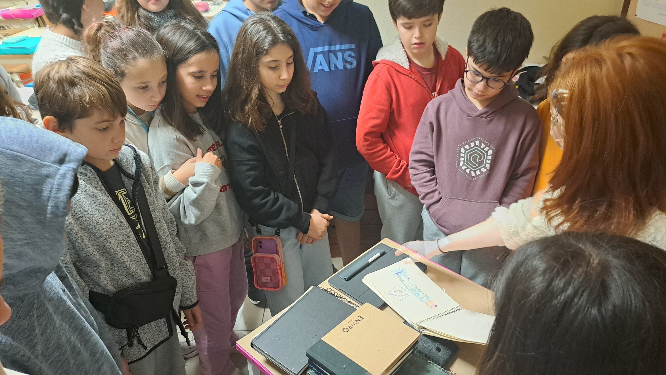 No segundo momento, os alunos tiveram a oportunidade de fazer uma viagem no tempo, observando e dialogando sobre os diários gráficos que a Margarida tem vindo a preencher desde a infância. A diversidade de estilos, técnicas e abordagens utilizadas ao longo dos anos despertou grande curiosidade e serviu de inspiração para os alunos.