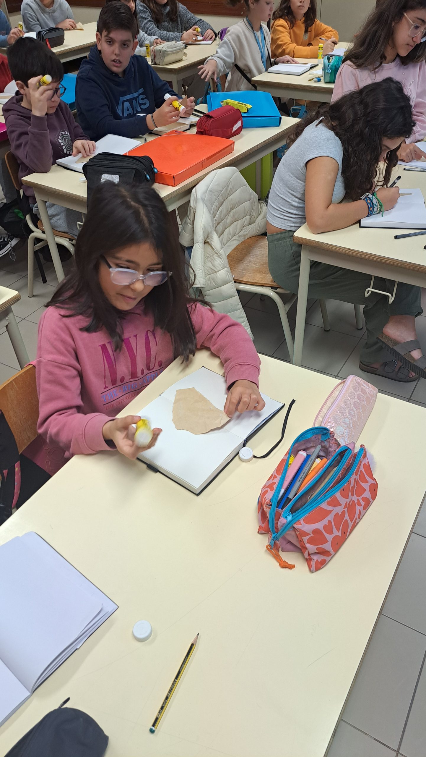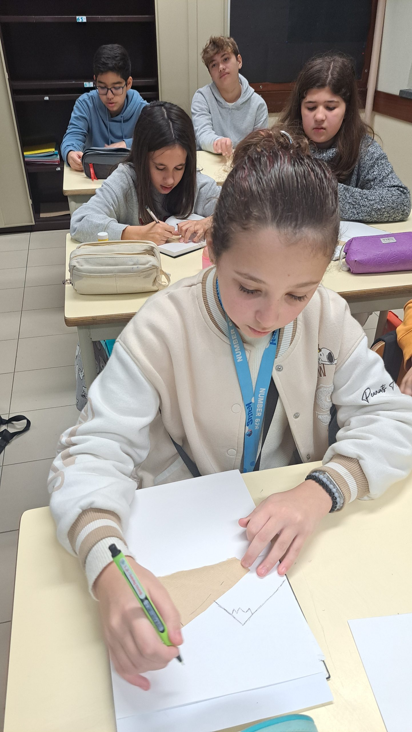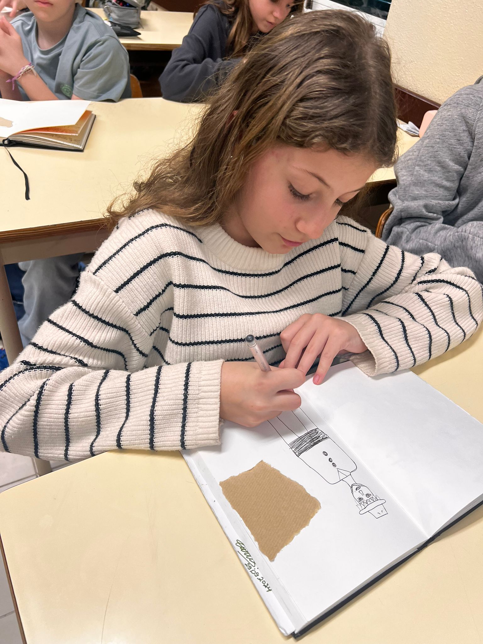 A Margarida trouxe consigo uma proposta inspiradora: a atividade “Entre a Mente e a Mão – Desvendando o Diário Gráfico”, cujo objetivo foi sensibilizar os alunos para a importância do diário gráfico como ferramenta de exploração artística e registo criativo.